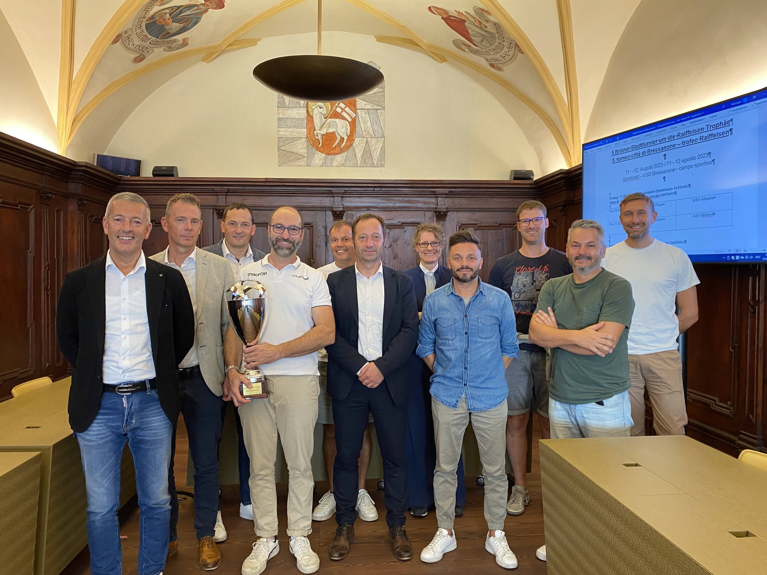 Foto v.l.: Bürgermeister Peter Brunner, Florian Holzer (Albeins), Stadtrat Andreas Jungmann, Andrea Cristanini (USD Bressanone), Konrad Gatterer (ASV Milland), Markus Gruber (ASV Milland), Esther Kammerer (Raiffeisen), Ivan Schneider (SSV Brixen), Max Tinkhauser (Plose), Christian Mlakar (SSV Brixen), Armin Michaeler