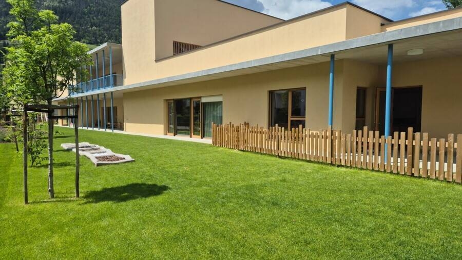 Der Neubau, gelegen in der Vinzenz-Gasser-Straße, wurde nach den Prinzipien nachhaltigen Bauens errichtet. Er zeichnet sich durch energieeffiziente Bauweise, natürliche Materialien und eine kindgerechte, offene Raumgestaltung aus. Insgesamt wurden knappe 5,9 Millionen Euro investiert, wovon fast zwei Millionen Euro vollständig aus dem Gemeindehaushalt finanziert wurden. Die verbleibenden Mittel stammen aus dem PNRR, dem nationalen Wiederaufbau- und Resilienzplan (M4C1 I 1.1).