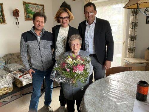 Bei der Geburtstagsüberraschung dabei waren auch Stadträtin Monika Leitner und Stadtrat Andreas Jungmann und überbrachten ihr ein Geschenk und die Glückwünsche der Stadt, worüber sie sich sehr freute.