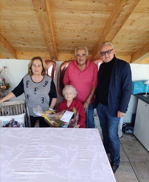 Liliana erfreut sich großer Beliebtheit in ihren Familien- und Freundeskreis und feierte gemeinsam mit ihrer engsten Familie ihren Ehrentag. Vizebürgermeister Ferdinando Stablum überraschte sie am vergangenen Montag und überbrachte ihr die Glückwünsche der Gemeindeverwaltung und einen Blumenstrauß für ihren 101. Geburtstag. Bereits im letzten Jahr nahm der Vizebürgermeister an der Feier ihres 100. Geburtstages teil.